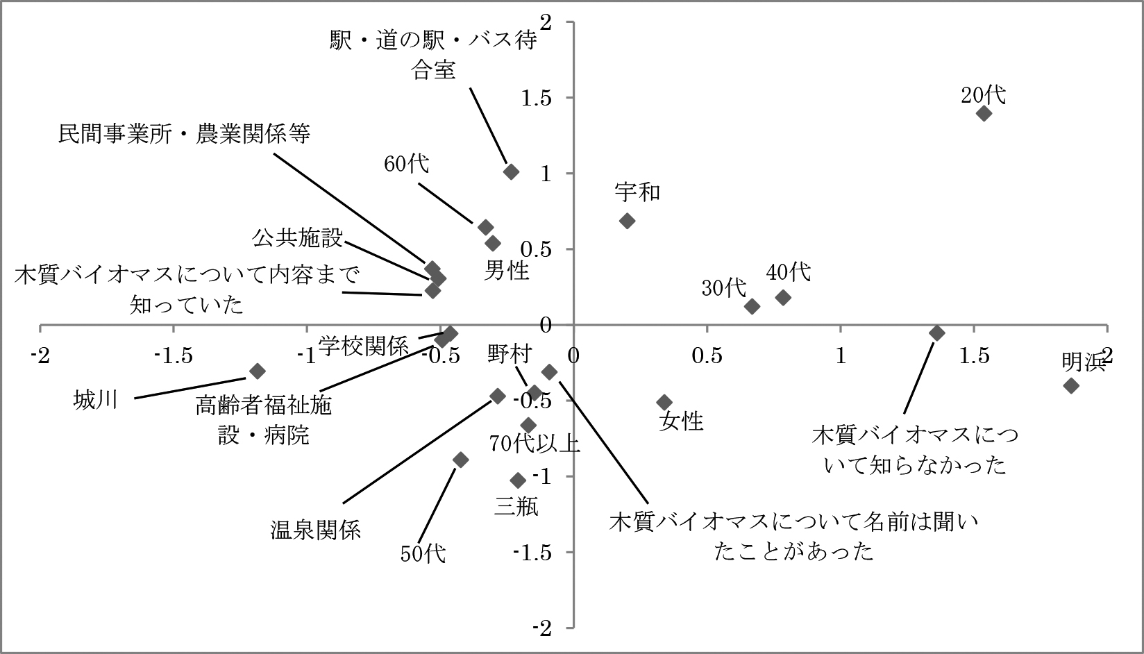 一方,第4象限には「明浜」や「女性」とともには「木質バイオマスについて知らなかった」がプロットされている.ここでは第1象限とともに具体的な施設がプロットされなかったことから,第1象限の結果を加味すると,本事例地では年齢が高い住民の方がこれらの施設への設置に関心が高いことが考えられる.
