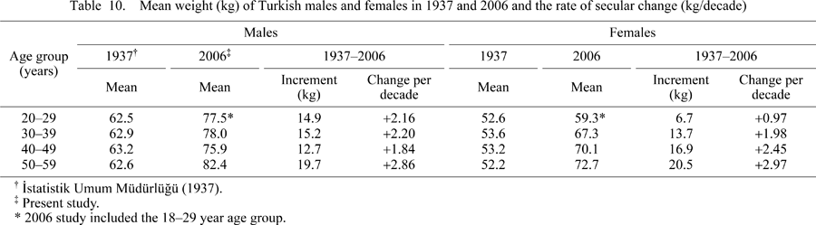 ![]() View Details | Figure 4. Secular increment in the mean weight (kg/decade) for Turkish males and females between 1937 to 2006. |
