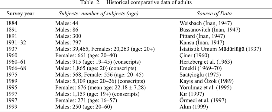 While secular changes in height and weight have been a focus of attention in an anthropological context in various populations, little attention has been devoted to Turkish populations. Anthropometric data on Turkish adults are relatively limited, and there is little information available regarding the occurrence of secular change. The first anthropometric data related to adult height for this population was reported by Weisbach in 1884 (as cited by Inan, 1947), followed by pioneering studies which focused mainly on adult male height. Concerning historical anthropometry in Turkey, two nationwide anthropometry data sets referred to the whole country. The first nationwide survey on both male and female adults which focused on various anthropometric traits was conducted in 1937 (Istatistik Umum Müdürlügü, 1937). The second nationwide survey was conducted by Çiner (1960) only on female subjects. In addition to these nationwide surveys, anthropometric studies on conscripts may represent national means as well as the country’s regional averages. In Turkey, military service is compulsory for all males when they reach the age of 19 years. Therefore, a random sample of military conscripts can be considered as a true national representation of males from all regions and all social strata. Hertzberg et al. (1963) were the first to collect data from Turkish conscripts, as a part of the North Atlantic Treaty Organization (NATO) anthropometric survey which was conducted in 1960–1961. Data on the Turkish conscripts were also collected and published in 1971 (Emekli, 1971), 1989 (Kayis and Özok, 1989), and 1997 (Kir, 1997).