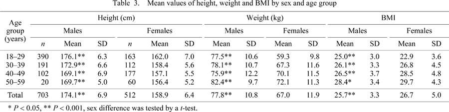 Contemporary mean height was found to be 174.0 cm (SD 6.9) for males and 158.9 cm (SD 6.4) for females. Contemporary mean weight was found to be 77.8 kg (SD 10.8) for males and 67.0 kg (SD 11.9) for females. Table 3 reports the sample size and mean values of height, weight and BMI by age group for both sexes. In every age group, height and weight exhibited statistically significant (P < 0.001) sex differences. Tables 4 and 5 present height and weight percentile values by sex and age group, respectively. QQ tests revealed overall satisfactory goodness-of-fit for both parameters by sex and age groups (95% confidence interval).