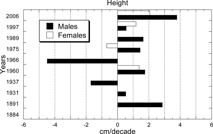 The secular trend is not completely linear. Figure 2 presents the differences in mean height between survey years. Periods of steady increase are followed by sudden decreases and subsequent recoveries. In the mid-1930s there was a slight decrease in mean male height. Anthropological studies performed after World War I (WWI) and the Independence War (1918–1923) showed a decrease in mean male height, while studies in the 1950s and 1960s indicate that mean height increased again. Survey results from the mid-1960s once again indicate a decrease in the mean height for males who were born during World War II (WWII) and the post-war depression. Increases in male height have been observed since the 1970s up to the present. The same pattern is evident for females, although both increases and decreases were smaller than those for males.