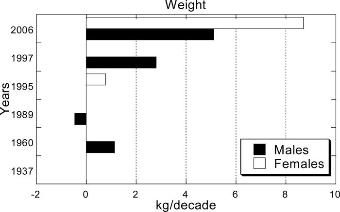 Figure 3 presents the changes in the mean weight of the Turkish population during the 69-year period from 1937 to 2006 (Table 9). Comparative data demonstrate that the mean weight of both sexes increased during this period. Overall, mean weight increased from 62.0 kg to 77.8 kg in males and from 52.9 kg to 67.0 kg in females. The rate of the secular increase was 2.29 kg/decade and 2.05 kg/decade for males and females, respectively (also see Figure 4). The secular gain in height showed a similar pattern in both sexes for this time period.