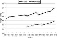 ![]() View Details | Figure 1. Secular change in the mean height (cm) of Turkish males and females between 1884 and 2006. |