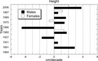 ![]() View Details | Figure 2. Secular increment in the mean height (cm/decade) for Turkish males and females between 1884 and 2006. |
