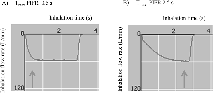The relationships between various inhalation flow profiles and drug dispersion have been examined,12) with high, sharp drug releasing pattern shown when Tmax PIFR was short. When Tmax PIFR was long, the drug releasing pattern had several peaks and was lower than that as compared to when Tmax PIFR was short. It was concluded that the inhalation flow profile and drug releasing pattern are related. Therefore, it is possible that the sum of the released drug and drug delivery in the lungs is the same when PIFR is the same and Tmax PIFR is different. In the future, it will be important to examine various factors that affect drug delivery into the lungs.