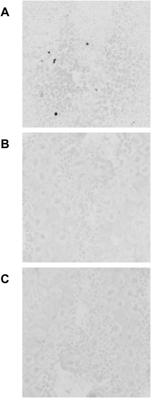ICR mice were applied with F-nSP70 (A), F-nSP300 (B), or F-mSP1000 (C) (each 125 µg/5 µL) to auricle skin, which was pretreated with mixed acetone/diethyl ether solution, for 3 d. Twenty-four hours after the last application, auricles were harvested and epidermal sheets were prepared. The epidermal sheets were observed under a confocal laser microscope. The colors in the images were inverted for improving the visualization in black and white. Black; silica particle, gray; DAPI.