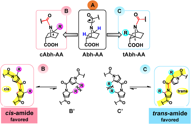 We have reported the synthesis of a bicyclic analogue of β-proline, 7-azabicyclo[2.2.1]heptanecarboxylic acid (Abh-AA, A, Fig. 1). We found that a bridgehead substituent at the C1- or C4-position in homooligomers of A can bias the cis–trans equilibrium: substituents at the C4-bridgehead position tip the equilibrium towards cis-amide conformation4) (cAbh-AA, B, Fig. 1), while introduction of substituents at the C1-bridgehead position causes complete switching to trans-amide conformation (tAbh-AA, C, Fig. 1), probably due to CNC angle strain or 1,3-allylic-type steric repulsion involving adjacent substituent groups5) (B′ and C′, Fig. 1). Our further structural studies revealed that homooligomers of either cis- or trans-amide can fold themselves into corresponding highly ordered helices.4–7) Moreover, unlike α-amino acid peptides, which are significantly stabilized by intramolecular hydrogen bonding, these helical structures are self-organized and conformationally stable without the aid of hydrogen bonding and irrespective of solvent (protic/aprotic/halogenated) or temperature. Combination of these bicyclic β-proline analogues and α-amino acids, that is, heterooligomers are also synthetically accessible, and the N-amide bond of these bicyclic β-proline analogues are reluctant to alkaline hydrolysis, indicating some metabolic stability.8,9) Furthermore, a shape similarity comparison of helical cis/trans bicyclic β-proline homooligomers with typical α-helical structure of α-amino acids reveals clear differences of geometry, such as pitch and diameter per turn (Fig. 2). While α-helix takes 3.6 residues/turn, cis-amide helix and trans-amide helix of β-proline homooligomers are estimated to take approximately 4 residues/turn and 2.7 residues/turn, respectively.4,5) Bridgehead substituents of the homooligomers point outwards from the helical surface.