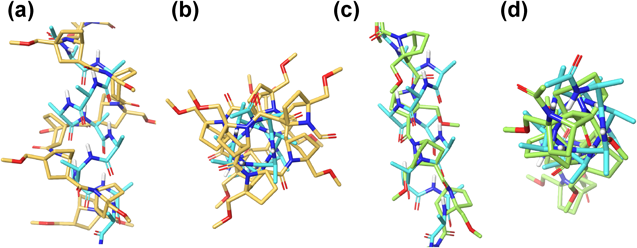 (a, b): Structural comparison of cis-amide helix with cAbh-AA (orange) and α-helix of α-alanine (light blue). (c, d): Structural comparison of trans-amide helix with tAbh-AA (green) and α-helix (light blue). A part of N terminus in tAbh-AA is not shown for clarity (d). (Color figure can be accessed in the online version.)