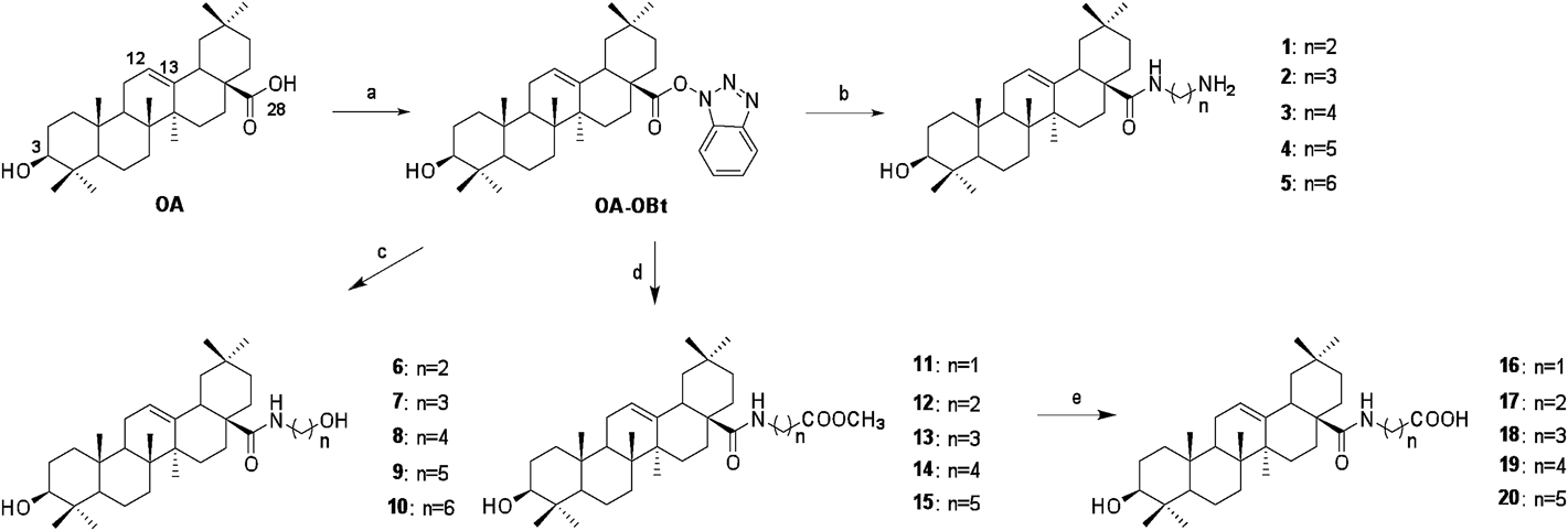 As shown in Chart 1, the C-28 of OA was first activated by 1-(3-dimethylaminopropyl)-3-ethylcarbodiimide hydrochloride (EDCI) and (CH3CH2)3N in the presence of 1-hydroxybenzotriazole (HOBt), then reacted with amine reagents, giving the corresponding OA derivatives (compounds 1–20) with high yields. The amine reagents were selected with different chain lengths and terminal functional groups to evaluate their influence on the anti-IAVs activity.