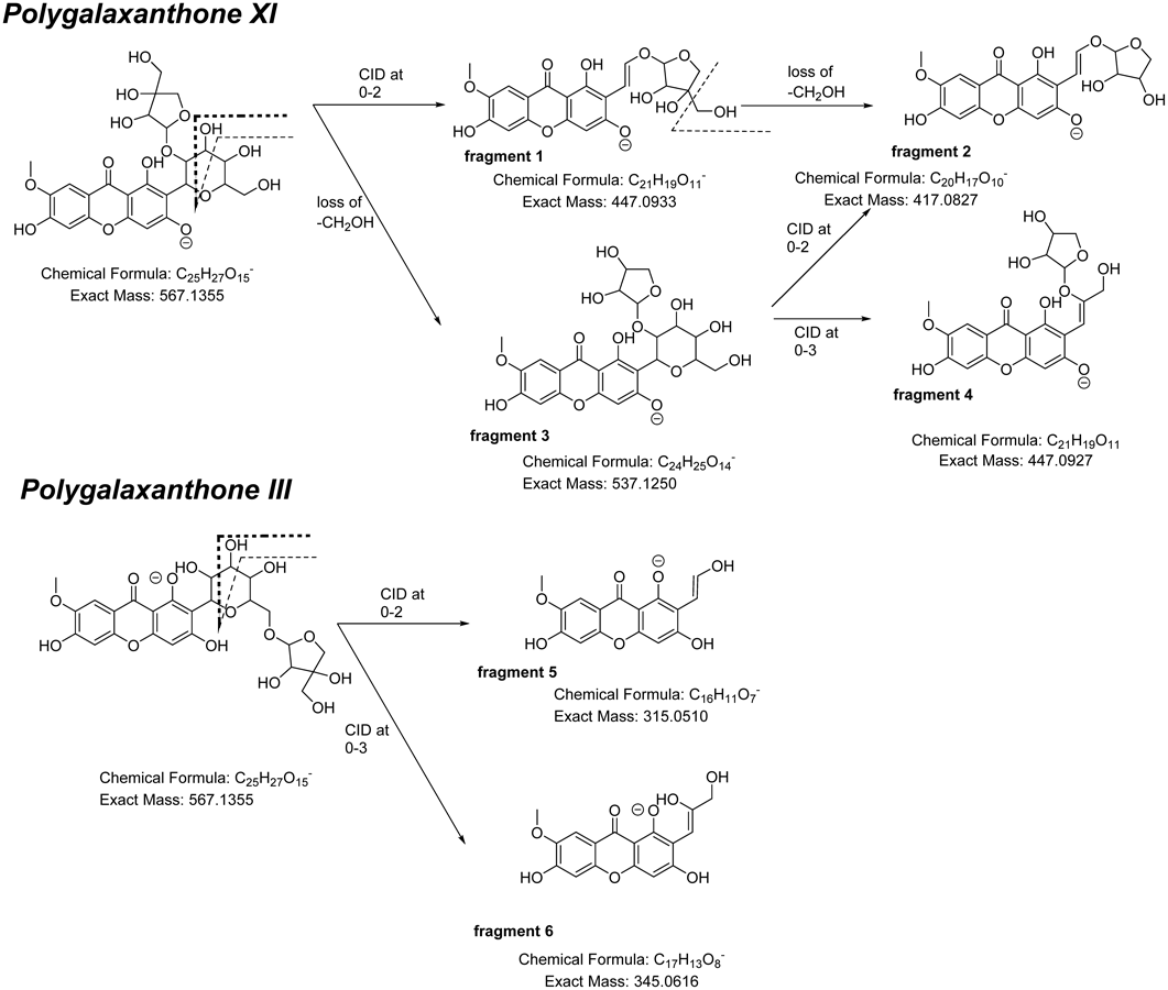 Two groups reported that in ESI (−)-LC-MS/MS, aryl-C-glucoside has a fragment in the form of collision-induced dissociation (CID) of the glycan moiety at 0–3 bond and 0–2 bond.12,13) Based on their results, the plausible fragmentations of PGX III and XI are shown in Chart 1. The m/z = 447 fragment (fragment 1) in the MS/MS spectra of samples 1 and 2 corresponded to the part of PGX XI for which positions 3 to 6 in the glucose moiety were eliminated due to cleavage at the 0–2 bond. The peak of m/z = 417 (fragment 2) was thought to be generated by elimination of the exocyclic hydroxymethyl group of the apiose moiety in fragment 1. Elimination of the hydroxymethyl group of the apiose moiety from PGX XI generated fragment 3 followed by the CID at the 0–2 or 0–3 bond, which generated fragment 2 at m/z = 417 or fragment 4 at m/z = 447, respectively. In contrast, PGX III CIDs at 0–2 bond and 0–3 bond could produce fragment 5 (m/z = 315) and fragment 6 (m/z = 345), respectively. Since the apiose moiety was connected to the glucose moiety at the 6-position in PGX III, the fragment of the C-glucosyl xanthone framework did not include an apiose moiety under the CID. On the contrary, in case of PGX XI, its apiose moiety was connected to the glucose moiety at the 2-position. Therefore, the architecture of the fragment of C-glucosyl xanthone would include the apiose moiety under the CID. Consequently, we found that MS/MS detection was a suitable method to discriminate PGX III and XI without authentic samples.