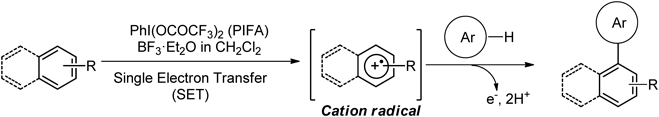 Because of their low toxicity and easy handling, hypervalent iodine reagents have emerged as viable alternatives to toxic heavy-metal reagents.48–54) We have studied novel oxidative bond formation reactions of electron-rich aromatic compounds using hypervalent iodine(III) reagents. As a result, we have developed the direct oxidative nucleophilic substitution of phenyl ethers with various nucleophiles using phenyliodine(III) bis(trifluoroacetate) (PIFA).55–57) In further study, a combination of Lewis acid and PIFA was used to identify a biaryl coupling reaction of phenyl ether and alkyl arene via a cation radical intermediate.58–63) The coupling reaction proceeds via cation radicals with the neutral molecule of the substrate to obtain a coupling product. We have recently reported hypervalent iodine(III) reagent induced oxidative cross-coupling reactions of aromatic compounds64–69) (Chart 2).