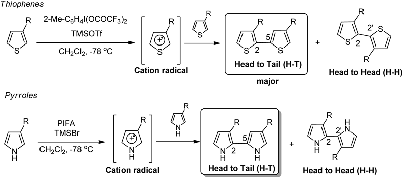Polythiophenes have attracted much attention due to their optical, electrical and electrochemical properties.70–72) Because the oxidation potentials of 2,2′-bithiophenes are lower than thiophenes, they can be polymerized under mild conditions, so that higher quality α-linked polymers can be synthesized from these than those prepared from thiophenes.71) However, it is difficult to control the reaction, and there has been no report of synthesis using oxidative coupling of thiophene due to the low oxidation potential of bithiophenes. Thus, bithiophene usually causes over-oxidation to produce oligomeric polythiophenes.73) We have succeeded in developing coupling reactions using hypervalent iodine(III) reagents to substituted thiophenes74,75) (Chart 3). However, these methods required excess substrate at low temperatures, and the product was a mixture of inseparable regioisomers. In the case of 3-substituted pyrrole, the coupling product could not be synthesized regioselectively.76,77) These reactions proceeded via cation radical intermediates to obtain coupling products. Thus, the regioselective coupling reaction of 3-substituted heteroaromatic compounds was not achieved.