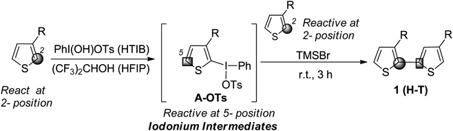 Next, we examined the cross-coupling reactions of various heteroaromatic compounds such as thiophene, pyrrole and indole. Based on our studies for the case of heteroaromatic compounds, the cross-coupling products were obtained in a low yield, and the undesirable homo-coupling reaction proceeded. The heteroaromatic compounds having different reactive sites are too sensitive to react selectively even through the single electron transfer (SET) oxidation processes using the hypervalent iodine reagents. On the other hand, as shown in Chart 6, regioselective synthesis of H-T dimers of thiophenes could be achieved via an iodonium(III) intermediate. Therefore, the oxidative cross-coupling reactions of heteroaromatic compounds using these iodonium salts as reaction intermediates were examined.