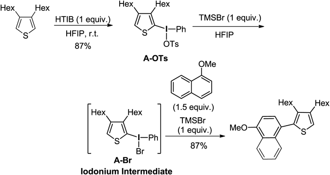 The cross-coupling reaction with 1-methoxynaphthalene was investigated using isolatable α-thienyl iodonium(III) salt A-OTs having a tosylate anion. As a result of the addition of various acids and heating, the reaction did not proceed, and the stable salt A-OTs was recovered from the reaction mixture. However, as a result of further examination of the additive, in the case of bromotrimethylsilane (TMSBr), the reaction of the iodonium salt A-OTs resulted in the formation of a cross-coupling product in a low yield. The solvents were then evaluated using TMSBr. As a result, when hexafluoroisopropanol (HFIP) was used, the yield of the cross-coupling product was improved, and the product was obtained in a yield of 87% (Chart 6). The use of 2 eq of TMSBr to the iodonium salt A-OTs was necessary to perform the reaction. When one equivalent of TMSBr was used, the iodonium bromide A-Br was produced quantitatively. Therefore, in our cross-coupling reaction, TMSBr should be used for the in situ formation of the iodonium bromide A-Br as a reaction intermediate.82,83)
