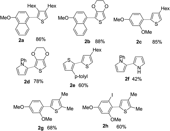The cross-coupling reaction between heteroaromatic compounds with electron-rich aromatic arenes proceeded without the formation of undesirable homodimers or over-oxidation (Chart 7). As the coupling partners to these salts, the nucleophilic properties of arenes are important factors in this cross-coupling reaction, and various aromatic nucleophiles can be used for the reaction, such as phenyl ethers and heteroaromatic compounds. In the case of thiophene–pyrrole, the reaction proceeded selectively to give the cross-coupling product 2d. Selective cross-coupling between arenes with similar properties, with iodonium salts as intermediates, was performed. The coupling reaction proceeded smoothly without by-production of the homo-coupling, producing good yield. As shown in product 2h, the halogen functionality remains unreacted during the reaction, which allows further modification of the mixed biaryl structure obtained using the reported bond-formation reaction.
