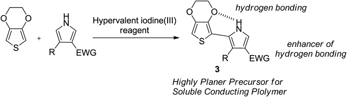 Thienyl-pyrrole and their derivatives are considered useful precursors because they can control their properties as corresponding polymers by introducing substituents on the pyrrole nitrogen atom.84–86) On the other hand, poly(3,4-ethylenedioxythiophene) (PEDOT)87–92) and polypyrrole are widely used as conductive polymers because of their useful properties.93–95) Therefore, we envisaged that hypervalent iodine(III) reagents would enable the oxidative coupling reaction for the synthesis of EDOT-pyrrole 396) (Chart 8).