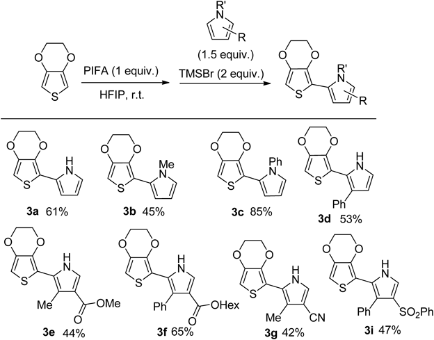 Based on our research results, we performed the coupling reaction of EDOT with various pyrroles. As shown in Chart 9, this resulted in coupling products 3a–3c being obtained in good yields. Ester substituted pyrroles also gave coupling products 3e to 3g in good yield. Pyrroles substituted with the electron-withdrawing groups cyano and sulfonyl as acceptor substrates gave the coupling products 3h–3j, respectively.