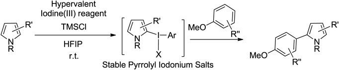 The pyrrole–aryl backbone is an important structural attribute, as well as an important structural motif of fluorescent dyes, organic conductive materials, and biologically active compounds.97–99) Therefore, the development of efficient synthetic methods for such pyrrole–aryls is of significant importance in the field of synthetic chemistry. We assumed that the stabilized pyrrolyl iodonium(III) salt could enable the cross-coupling of pyrrole. We found a direct cross-coupling reaction of pyrroles with aromatic compounds via stabilized pyrrolyl iodonium(III) salt100) (Chart 10).