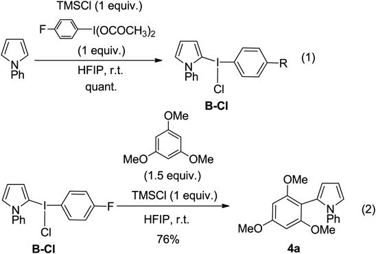 As a result of optimizing the reaction conditions, the best results were obtained when TMSCl was used with 4-furuorophenyliodine diacetate (4-F-PIDA) to form the pyrrole cross-coupling product (Chart 11, Eq. 1). To elucidate the reaction mechanism, it was found that when the combination with 4-F-PIDA and TMSCl was used, the iodonium intermediate B-Cl was produced in quantitative yield. The pyrrolyl iodonium salt B-Cl was then reacted with 1,3,5-trimethoxybenzene and TMSCl to afford the corresponding coupling product 4a in 76% yield (Eq. 2). From these results, it was determined that TMSCl and 4-F-PIDA are the best and most specific reagents for this coupling reaction.