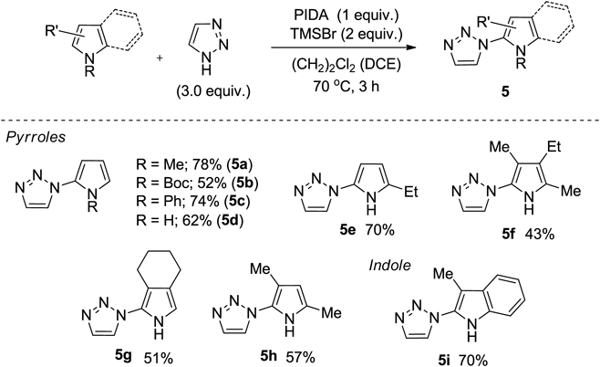 The coupling reaction that proceeds with pyrrolyl iodonium salt as an intermediate can be applied to the synthesis of N-pyrrolylazoles. The N-pyrrolylazoles serve as an important structural core of various natural products and functional materials.101–103) However, due to the instability of pyrrole based metals and halides, conventional approaches to N-aryl azoles have been limited to methods such as Ullmann coupling.104–106) Therefore, we examined the application of our coupling reaction pyrrole with azoles. As a result, when TMSBr was used in combination with PIDA, the best results were obtained in forming N-pyrrolylazole, and the C–N-coupling reaction proceeded in good yield.107,108)