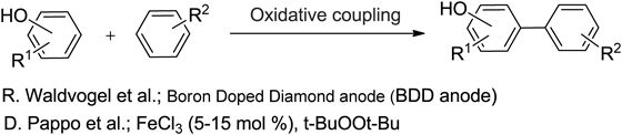 The oxidative cross-coupling of phenols has attracted significant interest from organic chemists due to its environmentally friendly methods and economic advantages.109–111) For the oxidative homo-coupling reactions of phenols, efficient methods have been reported, including the use of Fe, Cu, Mn and Ti salts.112–115) However, the cross-coupling reaction of phenols remains challenging due to the difficulty of controlling undesirable homo-coupling as a byproduct.116–119) In addition, the formation of high molecular-weight polymers or C–O-bond fomation reactions also proceeds readily under oxidative conditions.120,121) This is because the oxidation potential of phenol cannot be adjusted by introducing a protective group into the hydroxyl group, making it difficult to control its reactivity. Therefore, the development of a general method for the cross-coupling reaction of phenols is highly desirable. The cross-coupling reaction of phenols using a boron-doped diamond electrode has been reported by Waldvogel and colleagues122) (Chart 14). Recently, an iron-catalyzed oxidative cross-coupling reaction of phenols has also been developed.123) Although metal-catalyzed cross-coupling of phenols has been studied, the oxidative cross-coupling reaction using organooxidants is still extremely challenging.