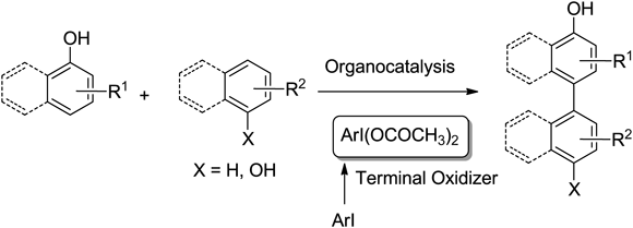 Recently we developed a stoichiometric hypervalent iodine(III) induced oxidative cross-coupling reaction of phenols.124) However, a catalytic version of the cross-coupling reaction of phenols using this hypervalent iodine(III) reagent remains to be achieved. Therefore, we investigated the oxidative cross-coupling reaction of phenols using an organic iodine(III) catalyst125) (Chart 15).