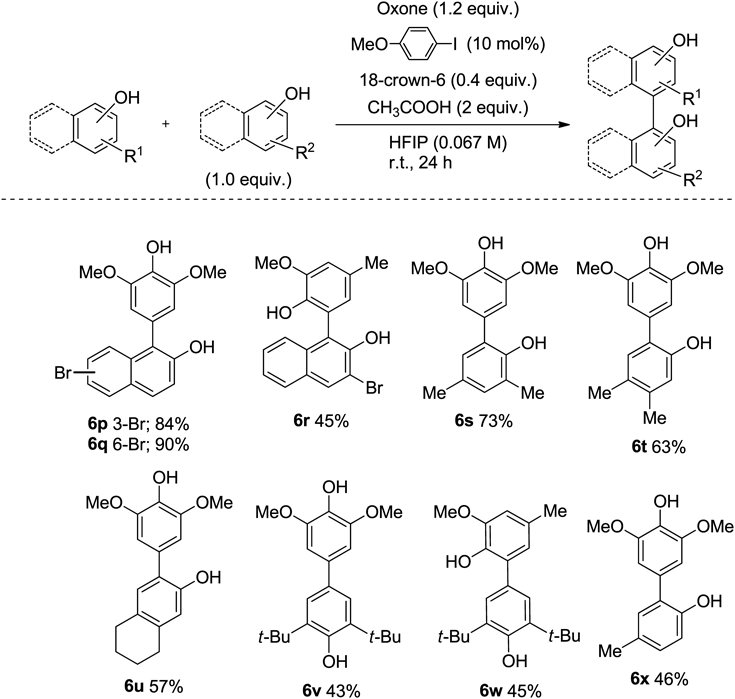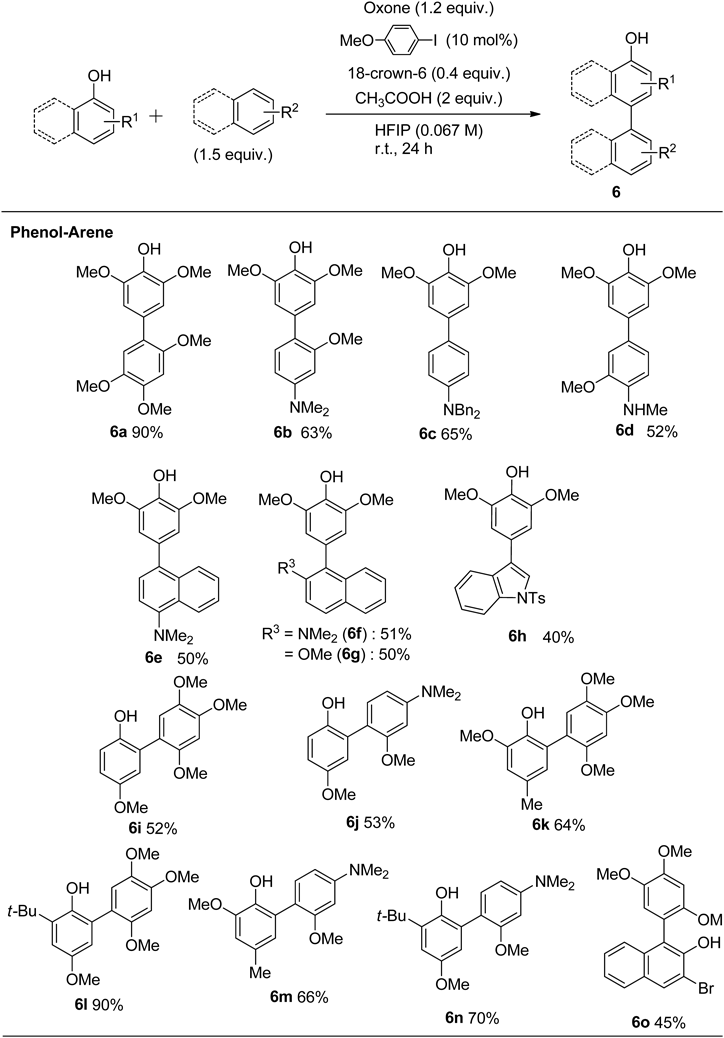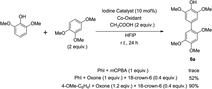 We chose a model reaction using 2,6-dimethoxyphenol and 1,2,4-trimethoxybenzene and a combination of iodoarene and mCPBA in HFIP. The use of mCPBA as the terminal oxidant was ineffective for phenol cross-coupling, as only trace amounts of cross-coupling products were obtained. To our delight, however, the use of Oxone led to the cross-coupled product in a yield of 52%. Various acids and solvents were carefully investigated in order to optimize the reaction conditions, and the best results were obtained when using 18-crown-6 and acetic acid (CH3COOH) and 4-methoxyiodobenzene as the iodine catalyst (Chart 16).