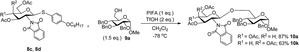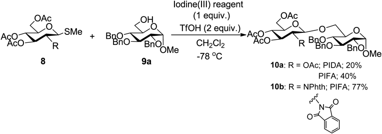 First, the readily available thioglycoside 8 as a donor and substrate 9 as an acceptor were treated with PIFA in dichloromethane in the presence of trifluoromethanesulfonic acid (TfOH). The corresponding glycosylated product 10a was obtained in moderate yield. Furthermore, when the reaction was performed with the donor 8b, which has a phthalimido group at the 2-position, the yield improved to 77% (Chart 21).