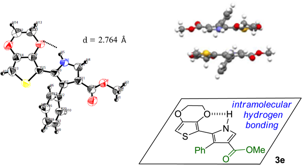 The structure of compound 3e was confirmed by single crystal X-ray analysis. As a result, the distance between N5 of 2.764 Å pyrrole and O3 of EDOT is shorter than the sum (3.07 Å) of the van der Waals radii of nitrogen and oxygen. That is, it was found that the strong hydrogen bond between the EDOT oxygen atom and the pyrrole NH group makes the thiophene ring and the pyrrole ring have a completely planar anticonformation. This O–H–N hydrogen bonding interaction is important for the self-planarization and stiffening of π-conjugated systems.
