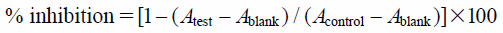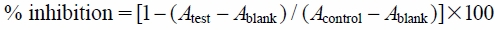where Acontrol is the absorbance of the control (DMSO) well, Atest the absorbance of the test wells, and Ablank the absorbance of the cell-free wells.
