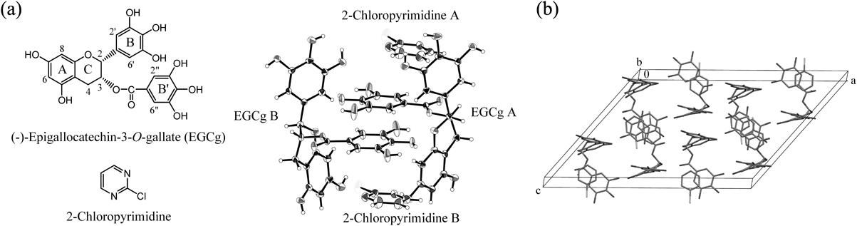 A single crystal was determined using X-ray crystallographic analysis. Based on an ORTEP drawing, this crystal contained two crystallographically different EGCgs (EGCg A and EGCg B) and two 2-chloropyrimidines, and these formed a 2 : 2 complex which the aromatic ring of the 2-chloropyrimidine and the B′ rings of each EGCg faced (Fig. 2a). Also, one unit cell contained four units of the 2 : 2 complex of 2-chloropyrimidine and EGCg and 24 H2O molecules as crystal solvent (Fig. 2b).