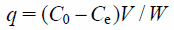 where q is the amount of borate ion adsorbed (mg/g), C0 and Ce are the concentrations before and after adsorption process (mg/L), V is the solvent volume (L), and W is the adsorbent weight (g).