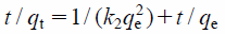 where k2 is the rate constant of the pseudo-second-order model adsorption (g/mg/h). The plot of t/qt versus t yields a straight line with a slope of 1/qe and an intercept of k2qe2.11,12,32,33)