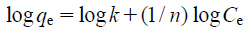 where qe is the adsorption capacity (mg/g) of the adsorbate, Ce is the equilibrium concentration (mg/L) of the adsorbate, and k and n are the Freundlich constants related to the adsorption of the adsorbent and the intensity of adsorption, respectively.