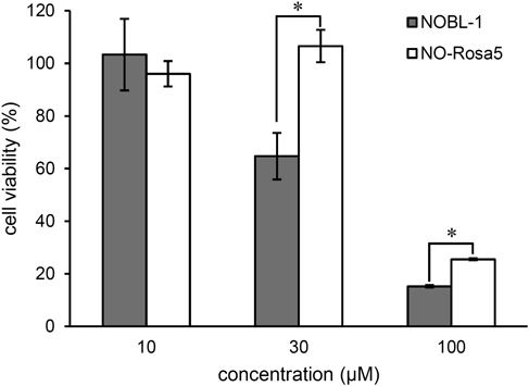After incubation of HEK293T cells with NOBL-1 or NO-Rosa5 for 48 h, cell viability was measured using WST-8. The results are mean ± standard deviation (S.D.) * p < 0.01 when compared by Student’s t-test (n = 3).