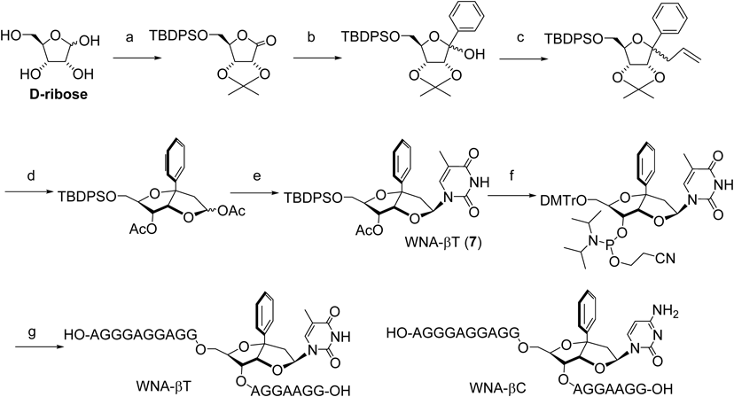 (a) (1) acetone, H+, 2) TBDPSCl, TEA, DMAP, CH2Cl2, 3) PCC, CH2Cl2; (b) (1) PhLi, THF; (c) allyltrimethylsilane, ZnBr2, CH3NO2; d) 1) OsO4, NaIO4, pyridine, 2) 5% H2SO4, THF, 3) Ac2O, pyridine, e) thymine, HMDS, TMSCl, SnCl4, CH3CN, f) (1) nBu4NF, THF, (2) aqueous NaOH, MeOH, (3) DMTrCl, pyridine, (4) iPr2NP(Cl)OCH2CH2CN, iPr2NEt, CH2Cl2; (g) (1) Automated DNA synthesizer, (2) 0.1 M NaOH, (3) 10% AcOH.