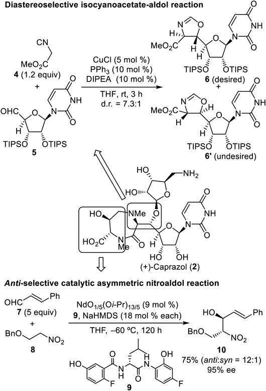 Chart 1 shows the two key stereoselective C–C bond-forming reactions in the total synthesis of caprazol,13) the diastereoselective isocyanoacetate aldol reaction14) employing methyl isocyanoacetate (4) and a uridine-derived aldehyde (5), and the antiselective catalytic asymmetric nitroaldol reaction reported by Nitabaru et al.15–17) using cinnamaldehyde (7) and benzylated nitroethanol (8). In the former, pronucleophile 4 is sufficiently active to undergo deprotonation at the α-position of the carbonyl functionality even with a tertiary amine to afford trans-oxazoline products 6 and 6′ almost exclusively, albeit with low facial selectivity, at 1.2 : 1. Copper-catalyzed conditions reported by Kirchner’s group18) (Chart 1) raise the ratio to as high as 7.3 : 1. In this reaction, structurally hindered protecting groups for the sugar moiety of 5 were essential: e.g., the isopropylidene congener diminished diastereoselectivity to 1 : 1.5 (the undesired isomer predominated). For the second key transformation, the nitroaldol reaction, an amide ligand 9 complexed with Nd and Na metals acts as a bimetallic bifunctional catalyst to activate both the electrophile 7 and pronucleophile 8 simultaneously. During the reaction course, an extended transition state is proposed to be operative to afford the anti-product predominantly. The use of 9 mol% of the catalyst system produced the desired enantiomer 10 in dr of 12 : 1 and 95% enantiomeric excess (ee).