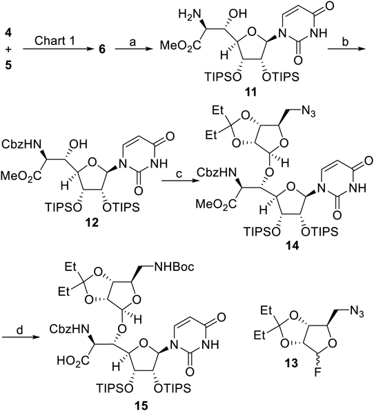 The resultant oxazolidinone ring of 6 was cleaved to give 11 in an acidic medium without damaging the stereochemical preference, which was followed by protection of the primary amine leading to 12 (Chart 2). According to the procedure reported for the total synthesis of caprazol,9–11) the subsequent Lewis acid-promoted glycosylation employing a fluorinated glycosyl donor 13 proceeded successfully.