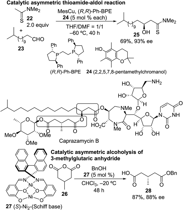 The subsequent task for the synthesis of caprazamycin B was preparation of the side chain moiety (western part) in a highly stereoselective manner.20) To address this issue, two catalytic asymmetric transformations were revealed to be effective, as shown in Chart 4. High enantioselectivity on the β-hydroxyester portion was achieved by the catalytic asymmetric thioamide-aldol reaction reported by Shibasaki’s group21–23): a catalytic amount of Cu(I) complexed with 1,2-bis(2,5-diphenylphospholano)ethane (Ph-BPE) promoted the addition of a thioamide 22 derived from acetic acid to an aldehyde 23 giving 25 in 93% ee. In the original report, no aldehyde having a long aliphatic carbon chain such as 23 was examined, meaning that the scope of the reaction was extended in this synthetic study. On the other hand, the unsymmetrically esterified glutaric acid found in this side chain portion was constructed by the newly developed catalytic asymmetric alcoholysis conditions.24) Toward this end, the binuclear nickel-chiral Schiff base complex 27, studied extensively by Shibasaki’s group, was the catalyst of choice.25–28) For this type of transformation, chiral organocatalysts including cinchona alkaloids have been widely used,29) although the availability of conditions for glutaric anhydride with sterically small substituents at the 3-position was limited. Moreover, naturally occurring alkaloids or their synthetic derivatives do not always guarantee the same level of selectivity upon obtaining enantiomeric products30–32) since pseudo-enantiomeric organocatalysts were used for this purpose. In this regard, metallic conditions can be used complementarily, and 88% ee of benzyl hemiester 28 was obtained with the use of 5 mol% of catalyst (Chart 4). That was one of the highest levels of selectivity observed for the 3-methylglutaric anhydride 26 at the time.