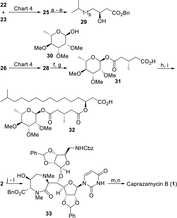 The subsequent coupling of 32 and the caprazol derivative 33 should have furnished all the requisite skeletal carbon atoms, although this proved troublesome owing to facile elimination of the β-hydroxyester substructure under most acylation conditions. Only Shiina’s protocol33) afforded the desired product in acceptable yield. Then, global deprotection in a manner similar to Takemoto’s route12) completed the synthesis of caprazamycin B.34) Later, catalytic asymmetric total synthesis of CPZEN-45 was also achieved,35) in which the aldol reaction to connect the uridine and diazepinone moieties was catalyzed by chiral linked-BINOL complexed with Zn(II) developed by Shibasaki and colleagues36–38) to improve the diastereoselectivity to as high as 79 : 1.