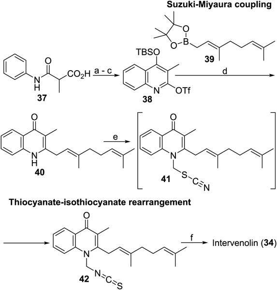 The synthesis of intervenolin has two key transformations, Suzuki–Miyaura coupling to introduce the geranyl group, and a thermal rearrangement from thiocyanate to isothiocyanate,60) as seen in Chart 6. To enable the cross coupling with geranylboronate 39, a quinoline derivative 38 was chosen as the substrate; the tert-butyldimethylsilyl (TBS) group was sequestered under the reaction conditions to afford 40 which has exactly the same structure as one of Pfizer’s compounds, CJ-13136. The substrate 38 was prepared by a combination of standard methods from 37. Deprotonation with an alkoxide bearing lithium as the countercation allowed selective introduction of the thiocyanate moiety at the 1-position.61–64) The presence of 41 in the media was transient with spontaneous rearrangement to the isothiocyanate 42. A one-pot protocol comprising the addition of methanethiolate and the subsequent methylation of the thiolate anion thus generated gave intervenolin.65) It is notable that the synthetic protocol is scalable: more than 1 g of intervenolin is easily obtained by a single run-through. An adequate amount of synthesized sample enabled in vivo examination of the antitumor effects in model mice inoculated with Hs738 cells, which clearly showed that intervenolin shrank tumor size even though the activity was not yet outstanding. Encouraged by this result, a primary SAR study was carried out66,67) (Chart 7).