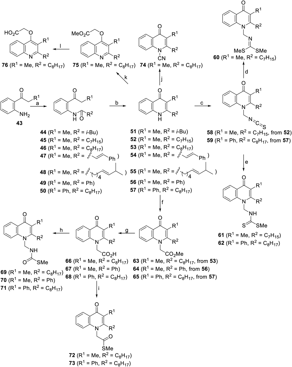The intermediates 51–57 were prepared starting from aniline derivative 43 by acylation to attach the side-chain portion at the 2-position (44–50) followed by dehydrative annulation. Installation of the 1-side chain was achieved by substitution with suitable electrophiles to give 58 and 59. The reaction sequence in Chart 7 from isothiocyanate 58 afforded 60 with the same pendant structure as that of intervenolin and a saturated long aliphatic chain instead of the geranyl part. Quenching was performed before methylation in this protocol for the formation of dithiocarbamate residues (61 and 62). Introduction of the acetate substructure at the 1-position was feasible to access 63–65, which were subsequently converted to carboxylic acid analogues 66–68 and then to thiocarbamates 69–71 and thioesters 72 and 73 in a divergent manner. On the other hand, changing the countercation to potassium upon the installation of an acetate unit gave the quinoline analogue 75 which was readily transformed into the carboxylic acid congener 76.61–64)