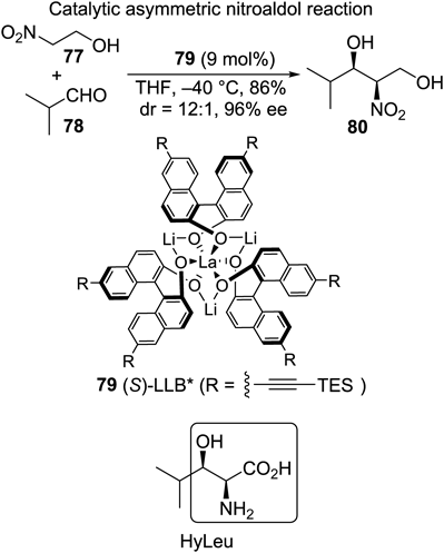 Another synthetic target, leucinostatin A, is composed of leucin and five types of unusual amino acids, β-alanine, 2-aminoisobutyric acid (Aib), threo-β-hydroxyleucine (HyLeu), 2-amino-6-hydroxy-4-methyl-8-oxodecanoic acid (AHMOD), and 4-methylproline (MePro). Chart 8 displays the catalytic asymmetric nitroaldol reaction with LLB* (79) developed by Shibasaki, Sasai and colleagues,69,70) which was utilized in this study to install all the carbon framework with the correct configuration. In the original report, 2-nitroethanol 77 was found to be one of the best substrates to attain perfect syn-selectivity and almost perfect enantioselectivity, whereas an α-branched aldehyde such as 78 was not examined. In the author’s study, the nitroaldol adduct 80 was obtained with essentially the same stereoselectivity (dr = 12 : 1, 96% ee), although increased catalyst loading up to 9 mol% was required.