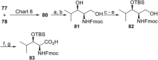 With the intermediate 80 in hand, the 9-fluorenylmethyloxycarbonyl (Fmoc)-protected HyLeu derivative 83 was synthesized by a sequence of standard manipulation of functional groups and protecting groups (Chart 9): reduction of the nitro group followed by Fmoc protection gave 81, which was subjected to silylation at the secondary hydroxy group leading to 82 and Pinnick oxidation.