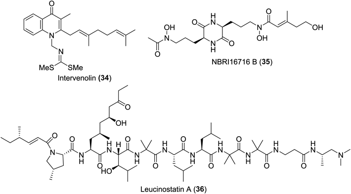 Intervenolin (34), produced by a strain of Nocardia, inhibits the growth of MKN-74 and MKN-7 gastric cancer cells co-cultured with Hs738 gastric stromal cells, and of Hs738 colorectal cancer cells co-cultured with CCD-18Co stromal cells.45) A diketopiperazine-based natural product, NBRI16716 B (35),46) and leucinostatin A (36)47) were found to decelerate the growth of DU-145 prostate cancer cells co-cultured with the corresponding PrSC stromal cells. The latter, a long-known natural product with a nonapeptide structure and diverse biological activities,48–57) reduced the expression of insulin-like growth factor I (IGF-I). However, at the outset of this research, the primary molecular targets of these three hit compounds were not known, which motivated my synthetic study aiming at the development of more potent analogues through SAR research and crafting molecular probes to bait counterpart proteins. This section focuses on efforts involving intervenolin (34) and leucinostatin A (36); a report on the synthetic study of NBRI16716 B (35) was also published elswhere.58)