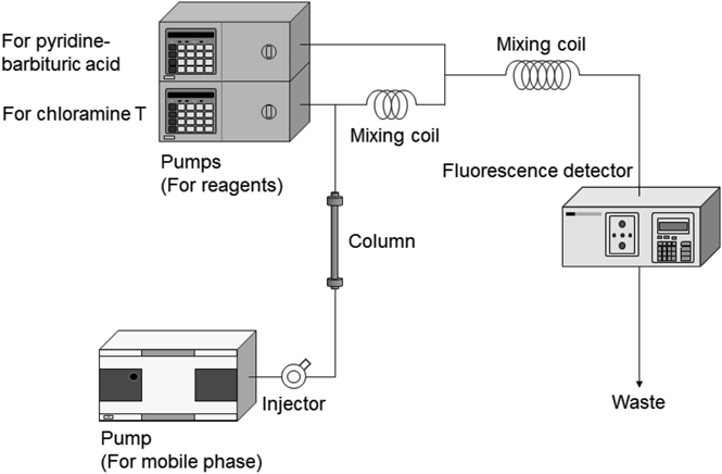 HPLC ConditionsThe HPLC system (Fig. 1) is essentially the same as that we previously reported.8) The system consisted of the Agilent 1100 Series (Agilent Technologies, Santa Clara, CA, U.S.A.), which contained a degasser, a pump (delivering mobile phase) and an autosampler. LC-10Ai and LC-10ATvp pumps (Shimadzu, Kyoto, Japan) were used to pump chloramine T solution and pyridine-barbituric acid solution, respectively. The fluorescent products were detected by an FP-1520S fluorescence detector (Jasco, Tokyo, Japan). The mobile phase was 0.1 M acetate buffer (pH 5.0) containing 12.5 mM sodium perchlorate/methanol (90/10, by volume) and its flow rate was 0.5 mL/min. A Scherzo SS-C18 column (3 µm, 250 × 4.6 mm i.d., Imtakt, Kyoto, Japan) with a guard column was used as the analytical column. 0.1% chloramine T aqueous solution was chosen as the chlorination reagent. The pyridine-barbituric acid solution consisted of 5% (w/v) barbituric acid, 15% (v/v) pyridine, and 3% (v/v) concentrated hydrochloric acid. Each reagent was pumped at a flow rate of 0.1 mL/min. The excitation and emission wavelengths were set at 583 and 607 nm, respectively.
