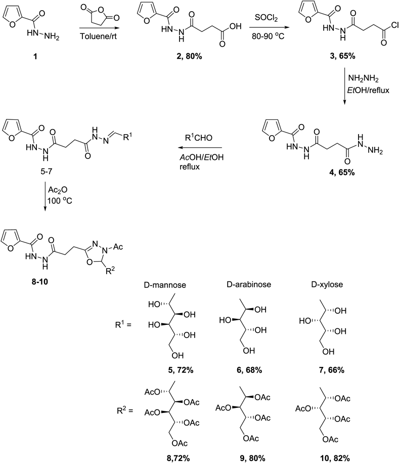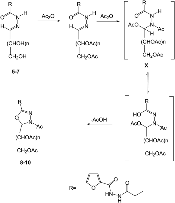 5-(O-Acetyl Sugar)-1-(3-acetyl-5-(2-(furan-2-carbonyl)hydrazinyl)ethyl)-2,3-dihydro-1,3,4-oxadiazole (8–10)General Procedure: A solution of the sugar hydrazones 5–7 (5 mmol) in acetic anhydride (10 mL) was heated at 100°C while connected with reflux condenser for 3 h. The resulting solution was cooled then ice-cold water (50 mL) was added with continuous shaking. The product was extracted with chloroform (40 mL) followed by addition of sodium hydrogen carbonate and the mixture was stirred for 45 min then filtered. The solvent was dried with calcium chloride and evaporated till dryness to afford the corresponding oxadiazoline substituted acetyl sugar derivatives 8–10.