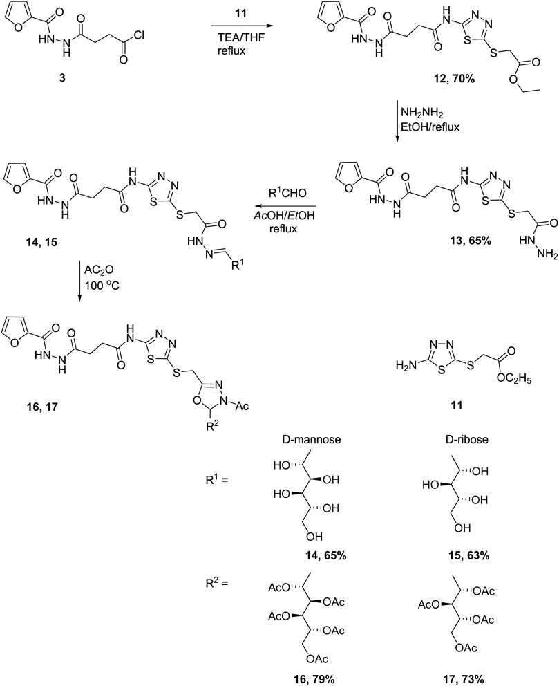 N-(5-(((4-Acetyl-5-(per-O-acetylsugar)-4,5-dihydro-1,3,4-oxadiazol-2-yl)methyl)thio)-1,3,4-thiadiazol-2-yl)-3-(2-(furan-2-carbonyl)hydrazinyl)propanamide (16, 17)A well stirred solution of the sugar hydrazones14 or 15 (10 mmol) in acetic anhydride (10 mL) was heated at 100°C 4 h at which TLC (methanol/chloroform; 0.4/9.6) showed completion of the reaction. The resulting solution was poured onto ice-cold water, and then extracted with chloroform (40 mL). Sodium hydrogen carbonate was added to the organic layer and mixture was stirred for 45 min and filtered. The chloroform layer was washed with water, dried with calcium chloride and evaporated till dryness to afford the corresponding acetyl sugar derivatives.