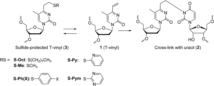 a) Conditions for the measurement of the half-life and the cross-linking reaction are described in the footnotes of Figs. 2 and 3. b) The S-pyridine protected T-vinyl could not be isolated due to its instability, therefore, its half-life was not measured.