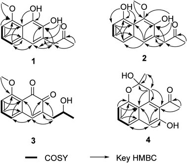 The molecular formula of 2 was established as C14H14O4, and its 1D NMR spectra were very similar to those of 1 (Table 1). In fact, the two-dimensional NMR analyses revealed that 2 comprises the identical tetrasubstituted naphthalene skeleton to that of 1 (Fig. 2). On the other hand, the HMBC correlations from two phenolic protons and a methoxy group and the downfield 13C resonance of the methoxy carbon (δC 62.5)10) strongly suggested that the methoxy group in 2 is attached to C1 (Fig. 2), and the chemical structure of 2 was completely determined (Fig. 1).